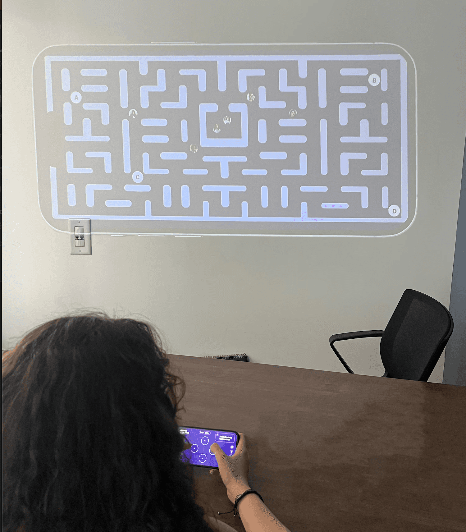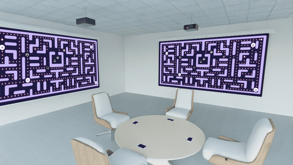 We combine the physical space with user interaction using a round table setup in a dedicated study room. Each user will have a projected image displayed on each wall to mirror the “hosts” screen for easy viewing and fair play. This setup improves visibility during the game portion of the study app and promotes student interaction.