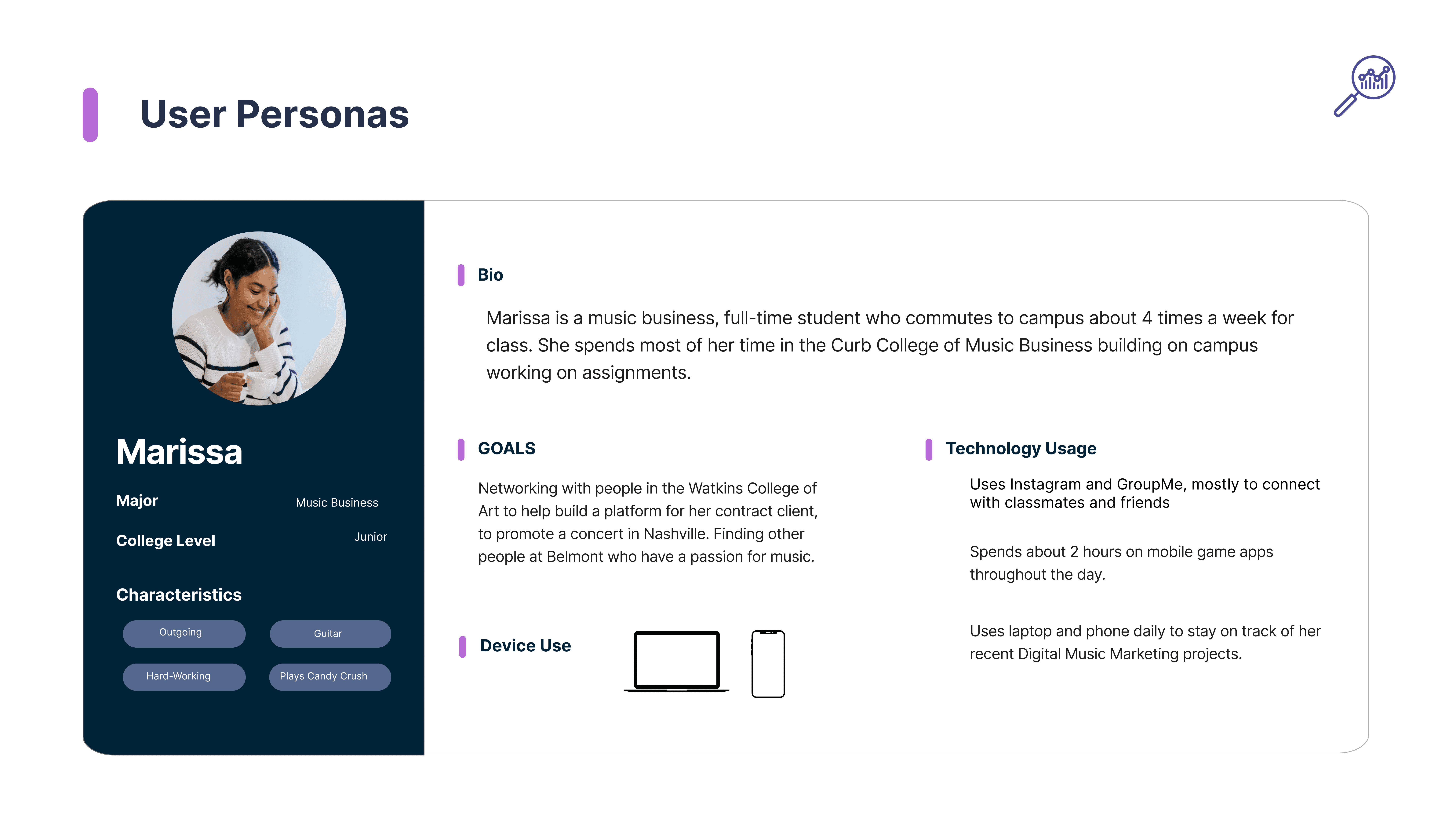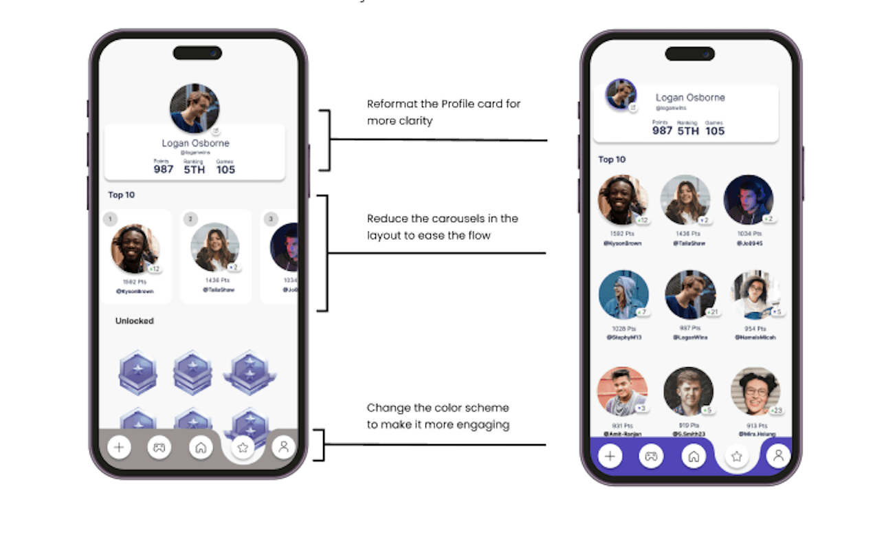 We tested the user experience with seven people. Users wanted a better screen layout with less scrolling and fewer carousels. They preferred a new layout for the profile info card and a different color scheme for the icons and navigation bar. We adjusted the color palette and redesigned the layout of the components for increased accessibility and more functionality.